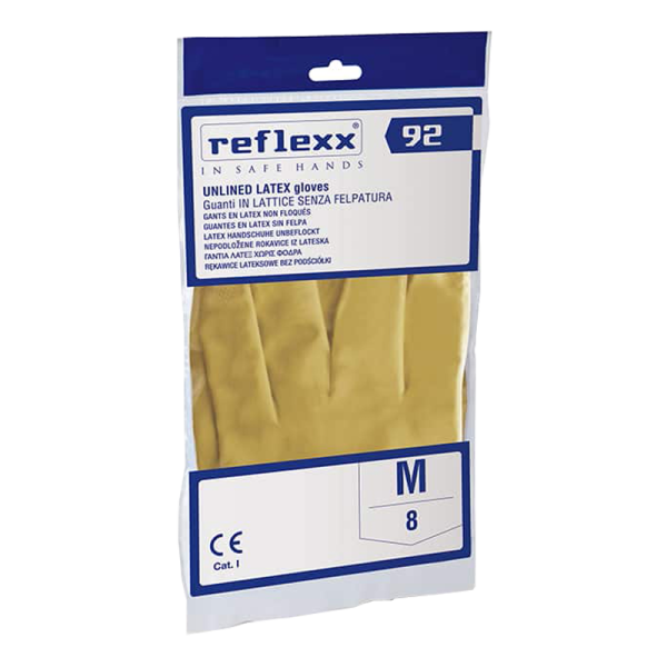 Rukavice gumene Reflexx R90 u veličini M izrađene su od otpornog lateksa i obložene tankim slojem pamuka s unutarnje strane, što pruža udobnost i zaštitu ruku tijekom čišćenja ili rada s deterdžentima. Elastične su i prilagođavaju se obliku ruke, a protuklizna tekstura omogućuje sigurno prianjanje i bolju kontrolu pri radu. Namijenjene su za kućnu i profesionalnu upotrebu, osobito kod poslova čišćenja, pranja posuđa ili rada u vlažnim uvjetima.